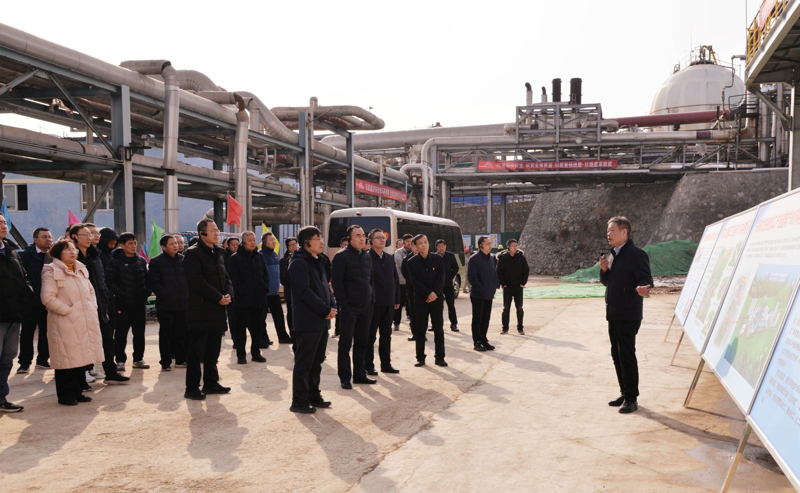 觀摩團(tuán)走進(jìn)項(xiàng)目建設(shè)現(xiàn)場(chǎng),實(shí)地查看建設(shè)進(jìn)展情況。徐愛(ài)軍向觀摩團(tuán)集中介紹了公司新建年產(chǎn)10萬(wàn)噸甲胺項(xiàng)目的最新進(jìn)展及 “十四五”發(fā)展規(guī)劃。